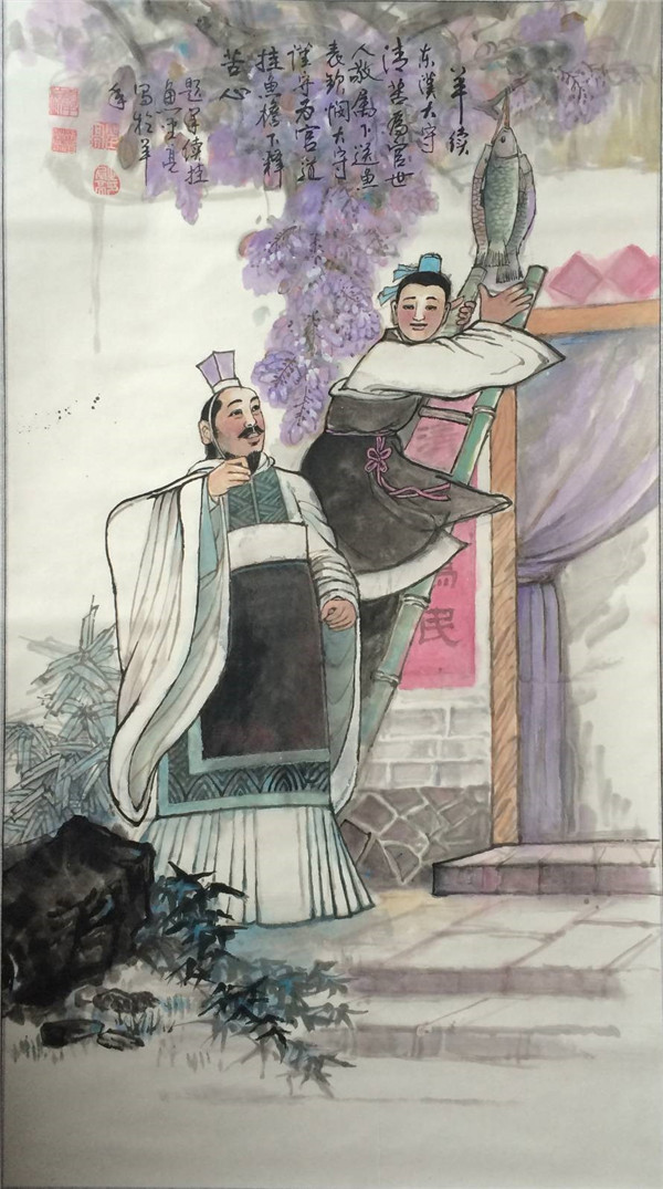 东汉名臣。在南阳郡任太守时,一位府丞见羊续生活清苦,特送来一串当地特产——白河鲤鱼。羊续很为难:收,有违为官之道;不收,有负下属盛情。于是,便将鲤鱼悬挂于庭檐下,久之便成鱼干了。之后,下属又送鱼来,羊续手指鱼干,轻轻摇头。下属为羊续的清廉自守和良苦用心所触动,含羞而去。?