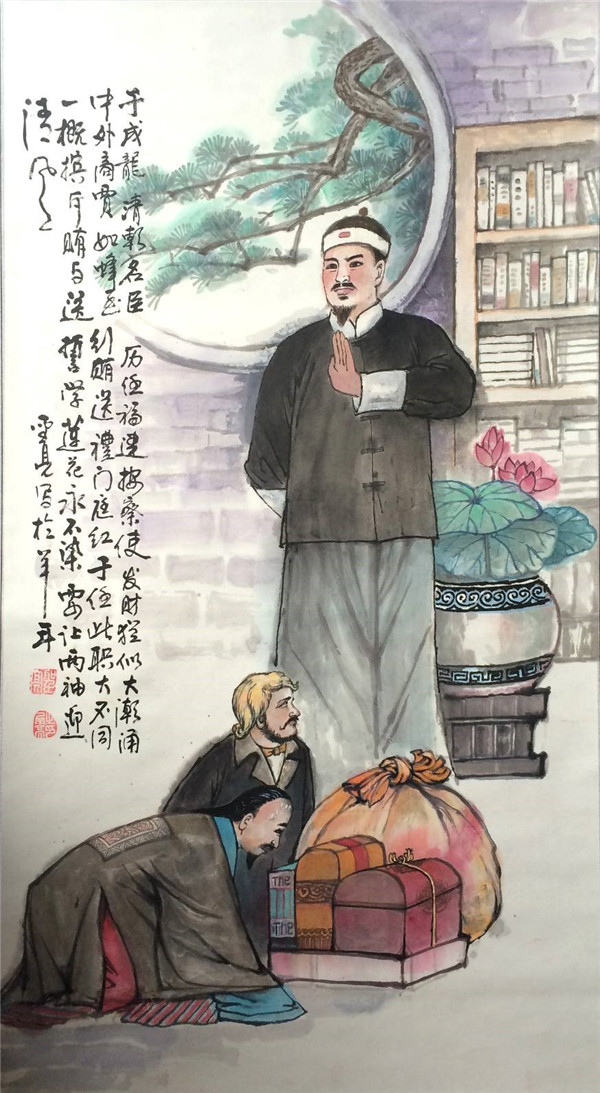 字北溟,山西人,清朝名臣,官至布政史,督抚大员。于成龙为官清廉自守,多行善政,深得士民爱戴。康熙17年,于成龙任福建按察史,当时外国商船靠岸贸易,发财易如反掌,洋商巨富都得按惯例给按察史送礼行贿。然于成龙严守清廉,一概摈斥行贿送礼。?